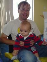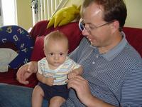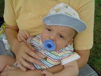 Robert turned 4 months on tuesday. Yesterday I took him for his 4 month well-baby check-up. He now weighs 14 lb 10 oz which puts him in the 50% for weight, and is 25 3/4 inches long which puts him in the 75% for height. The doctor said we can try to see if he wants to start solid food. We can try giving him some rice cereal but if he doesn't want it, then wait another month before trying again.