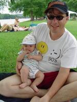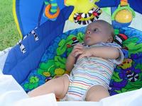 We spend yesterday afternoon at the lake. It was warm (and very humid) but cloudy, so we didn't have to worry about the little guy getting too much sun. He happily lay on the towel and played with his feet. We tried dipping Robbie's feet in the water to see how he'd react, but the water was cold and he didn't like that at all. It took him a few minutes to forgive us.