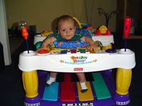 Captain Jakobs punches a few buttons on his command central and turns his ship in a new direction. "Oh Oh, there's two space monsters on my left", he thinks to himself. He pushes another button and launches a missile between the big black space monster and the small golden one, scaring them off. "Whew, saved the day again", he thinks. He steps on a foot pedal and changes course again. Suddenly he sees a large creature head towards him, it reaches it's hands into his cockpit. "That's enough time in the exersaucer sweetie, let's check your diaper" it says as it lifts him out of his seat.