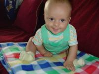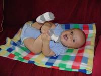 Other than that he's been developing a lot in the last week or so. Whenever he sits in my lap, leaning against me, he's always trying to lean forward to sit by himself. He uses his hands to gain some sort of balance. He also often leans forward to grab a foot and tries to stick the foot in his mouth. Maybe that's why he didn't want solid food, he's happy just eating his foot and hands. He's also rolling from his back to his side a lot. He's getting to a point where we can't just leave him on the sofa alone for a few minutes because he might roll off. He's been using his hands more and more in the last month. He's reaching for things and grabbing everything in sight (and sticking it in his mouth). This is a fun time for us because you can interact with him in so many ways now.