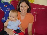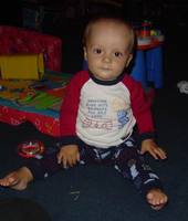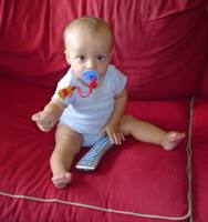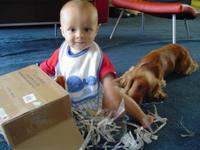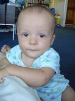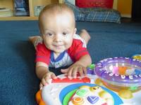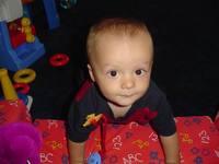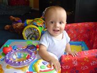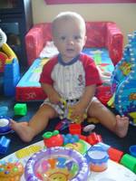 Robbie turned 8 months a few days ago. He doesn't fit into a lot of his size 6-9 month clothes anymore so we've had to buy some 12 month clothes. My little boy is growing so quickly! He's almost out of the baby clothes and into the toddler sizes. He's crawling forward now, but only does it if he really wants to reach something like a doggie toy or another forbiden object. He's mostly working on trying to stand up. He grabs onto anything near him and uses it to lift himself into a standing position. He can stand for a little while holding onto something.