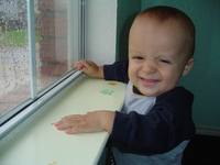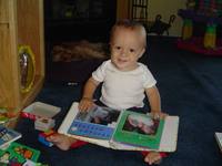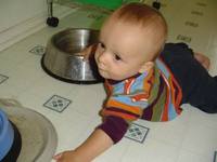 He spends most of his waking hours crawling around and likes going to any windows or any furniture where he can pull himself up to a standing position. His favorite crawling targets are the window blinds on the patio door, the doggie door, the stairs (we've now installed a baby gate there), and the dog's food and water dishes in the kitchen. Yes, he has tasted the dog food, but judging from his face he didn't care for it much.