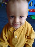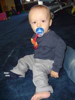 Robbie's 11.5 months, almost a year old! He's getting closer to walking, he walks behind a wagon (when he's not giving it a wheel allignment, see above), and can stand for longer periods. This month he's been working on his fine motor skills. He can now push a button with just one finger instead of banging on it with his entire hand. He's also learned to do more things on his laugh-n-learn home. He can turn the light on or off, open or close the window, put a ball in the water spout (it's a very small hole and he had a hard time getting the ball in there at first). He's also getting better at turning pages in his books by himself.