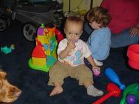 Robbie turns 1 today! He had a doctor's check-up and is healthy. He's been sick a lot in the past few months and he just had an ear infection last week, but that's gone now. He weighed at 19 lb 5 oz and 30 3/4 inches (8.8 kilo, 78 cm). His doctor said we can start giving him cow's milk, no more formula. She said to give him breakfast, lunch, an afternoon snack and dinner and no inbetween snacks so he gets used to being without food for a few hours.